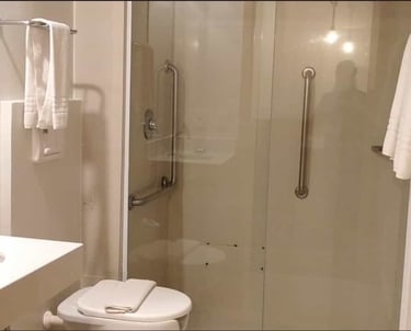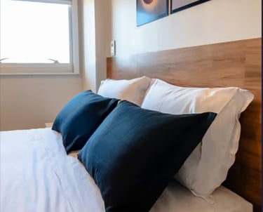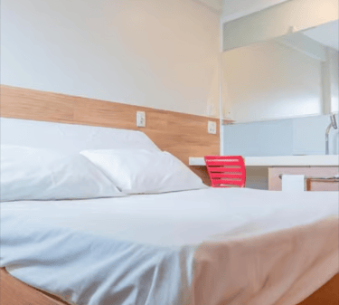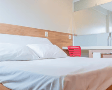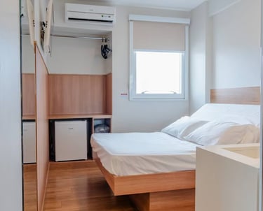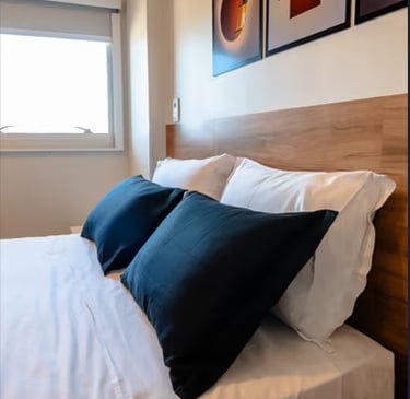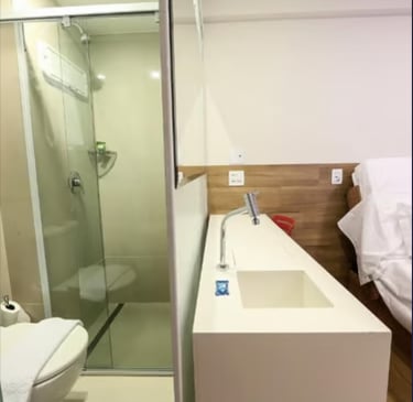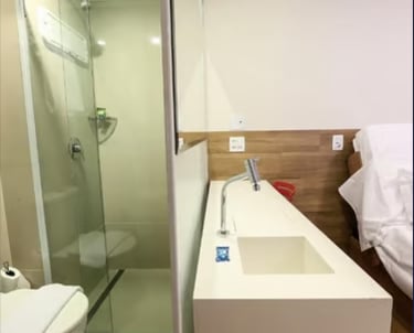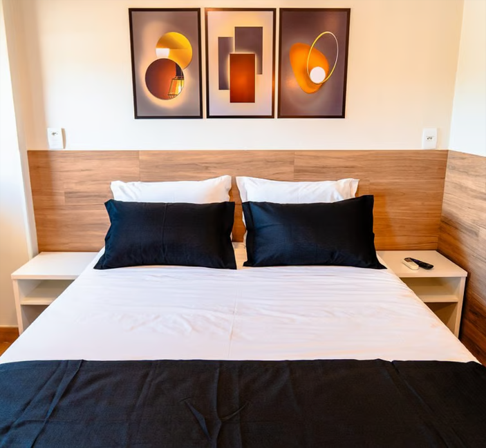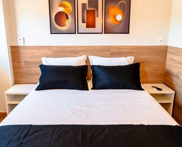 Uma suite ampla e moderna, decorada e mobiliada com materiais de alto padrão, que pode receber até 2 pessoas