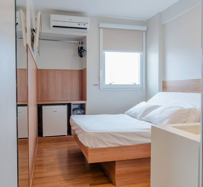 É um apartamento compacto e completo com todo o conforto. Uma solução de planta inteligente que aproveita cada espaço para aumentar a sua funcionalidade. A suíte tech foi toda mobiliada e decorada com materiais de alto padrão.